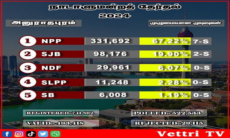 2024 நாடாளுமன்ற தேர்தலின் அனுராதபுரம் மாவட்டத்தின் முழுமையான தேர்தல் தொகுதி முடிவுகள் வெளியாகியுள்ளன.