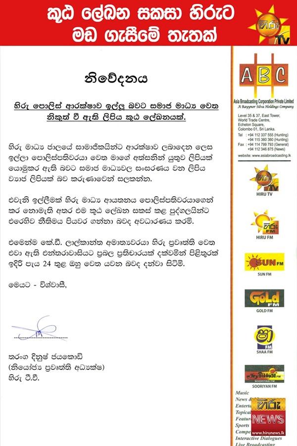 ஹிரு செய்தி நிறுவனம் வெளியிட்ட செய்தி தொடர்பில் அமைச்சர் கே.டி லால்காந்த அனுப்பிய சட்ட அறிவித்தல் கடிதத்துக்கு அடுத்த 24 மணி நேரத்துக்குள் பதில் அனுப்படும் என ஹிரு மீடியா நெட்வொர்க் தெரிவித்துள்ளது.