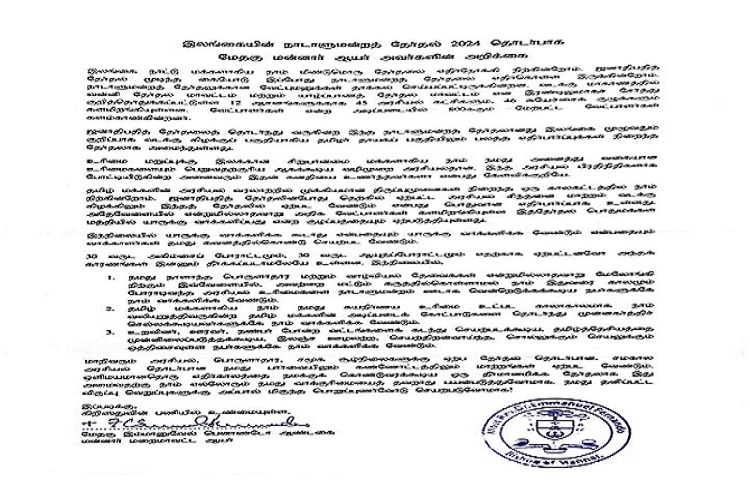 இலங்கை நாடாளுமன்ற தேர்தல் (2024) தொடர்பாக மன்னார் மறைமாவட்ட ஆயர் மேதகு இம்மானுவேல் பெர்னாண்டோ ஆண்டகை விடுத்திருக்கும் அறிக்கையில் இவ்வாறு குறிப்பிடப்பட்டுள்ளது.