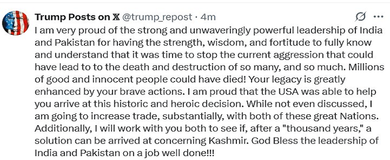 இந்தியா மற்றும் பாகிஸ்தானின் வலிமையான மற்றும் அசைக்க முடியாத சக்திவாய்ந்த தலைமையைப் பற்றி நான் மிகவும் பெருமைப்படுகிறேன். இந்த சண்டை பலரின் மரணத்திற்கும் அழிவுக்கும் வழிவகுத்திருக்கலாம். மில்லியன் கணக்கான நல்ல மற்றும் அப்பாவி மக்கள் இறந்திருக்கலாம். உங்கள் துணிச்சலான செயல்களால் உங்கள் மரபு பெரிதும் மேம்படுத்தப்பட்டுள்ளது. இந்த வரலாற்று மற்றும் வீரமிக்க முடிவை எட்டுவதற்கு அமெரிக்கா உங்களுக்கு உதவ முடிந்தது என்பதில் நான் பெருமைப்படுகிறேன். விவாதிக்கப்படாவிட்டாலும், இந்த இரண்டு பெரிய நாடுகளுடனும் நான் வர்த்தகத்தை கணிசமாக அதிகரிக்கப் போகிறேன் என்று தெரிவித்துள்ளார் ட்ரம்ப்.