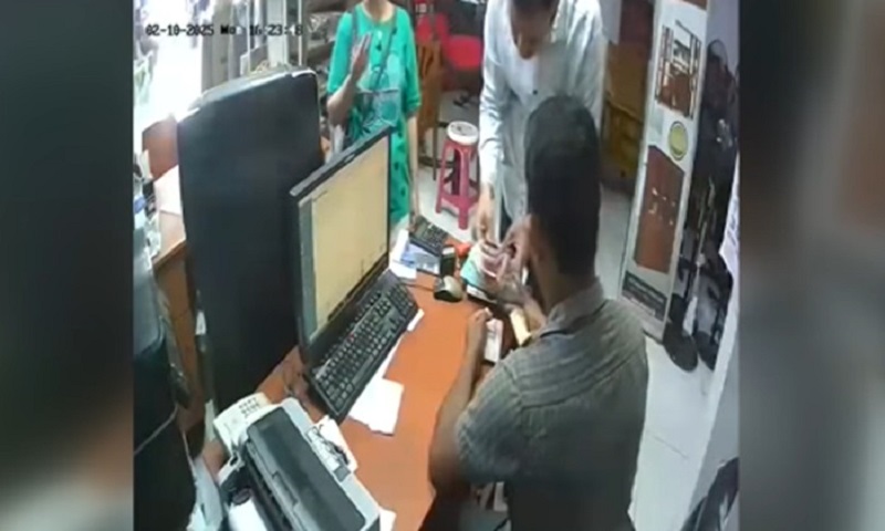 சம்பவத்தின் சிசிடிவி காட்சிகளில், வெளிநாட்டினர் உள்ளூர் ரூபாய் காசுகள் குறித்து கடை காசாளருடன் உரையாடுவதைக் காட்டுகிறது.