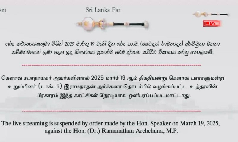 பாராளுமன்றத்தில் அர்ச்சுனா எம்.பி உரையாற்ற கட்டுப்பாடு விதிக்கப்பட்டுள்ளது.
