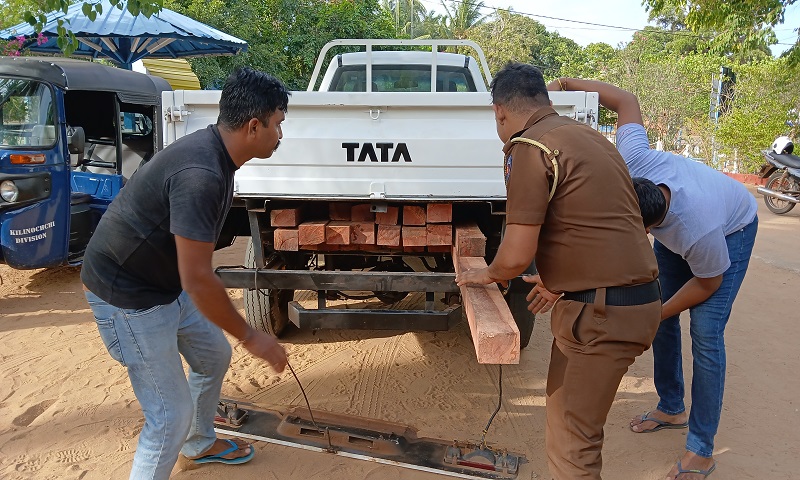 கிளிநொச்சி மாவட்டத்தின் தர்மபுரம் பொலிஸ் பிரிவுக்கு உட்பட்ட புளியம் பொக்கனை பகுதியில் வீதிச் சோதனையில் ஈடுபட்ட பொலிஸாருக்கு கிடைக்கப்பெற்ற இரகசிய தகவலுக்கு அமைவாக புதுக்குடியிருப்பு பகுதியில் இருந்து யாழ்ப்பாணம் நோக்கி பயணித்த கப்ரக வாகனத்தில் சூட்சுமான முறையில் வாகனத்தின் அடிப்பகுதியில் மறைத்து கொண்டு செல்லப்பட்ட பெறுமதி மிக்க 32 பாலை மர குற்றிகளை பொலிஸார் பறிமுதல் செய்துள்ளதுடன் கப்ரக வாகனத்தின் சாரதியும் பொலிஸாரால் கைது செய்யப்பட்டுள்ளார்.