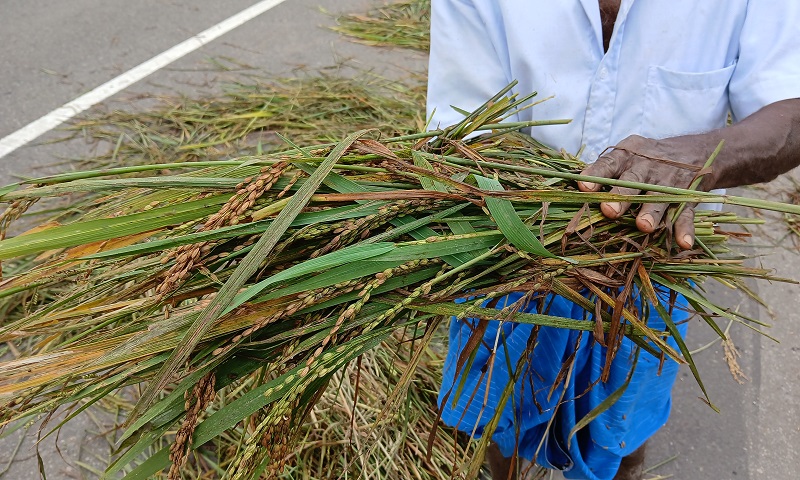 அறுவடை இயந்திரம் கொண்டு அறுவடை செய்ய முடியாத நிலையில் தொடர்ச்சியாக வெள்ள நிலமை காரணமாக தமது உணவுத்தேவைக்காவது அரிசியை பெற்றுக்கொள்ளும் நோக்குடன் கையினால் நெல் அறுவடை செய்து வருகின்றனர்.
