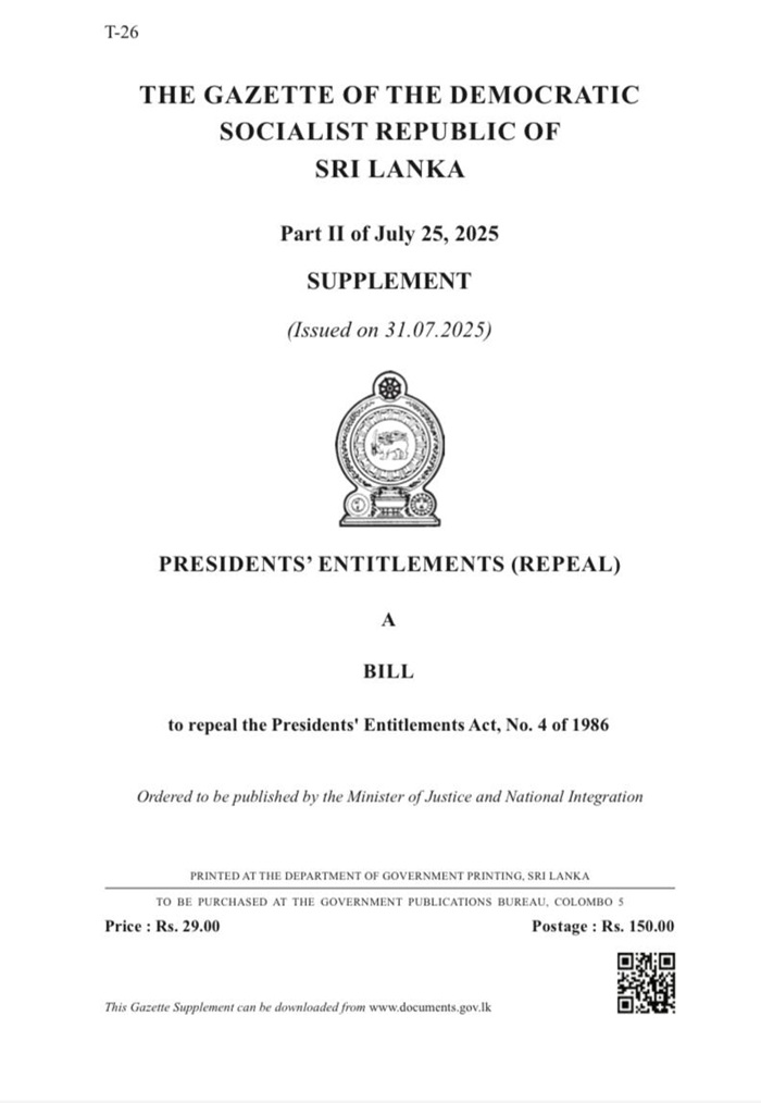 முன்னாள் ஜனாதிபதிகளுக்கு வழங்கப்படும் வரப்பிரசாதங்களை ரத்துசெய்வதற்கான சட்டமூலம் வர்த்தமானியில் வெளியிடப்பட்டுள்ளது.