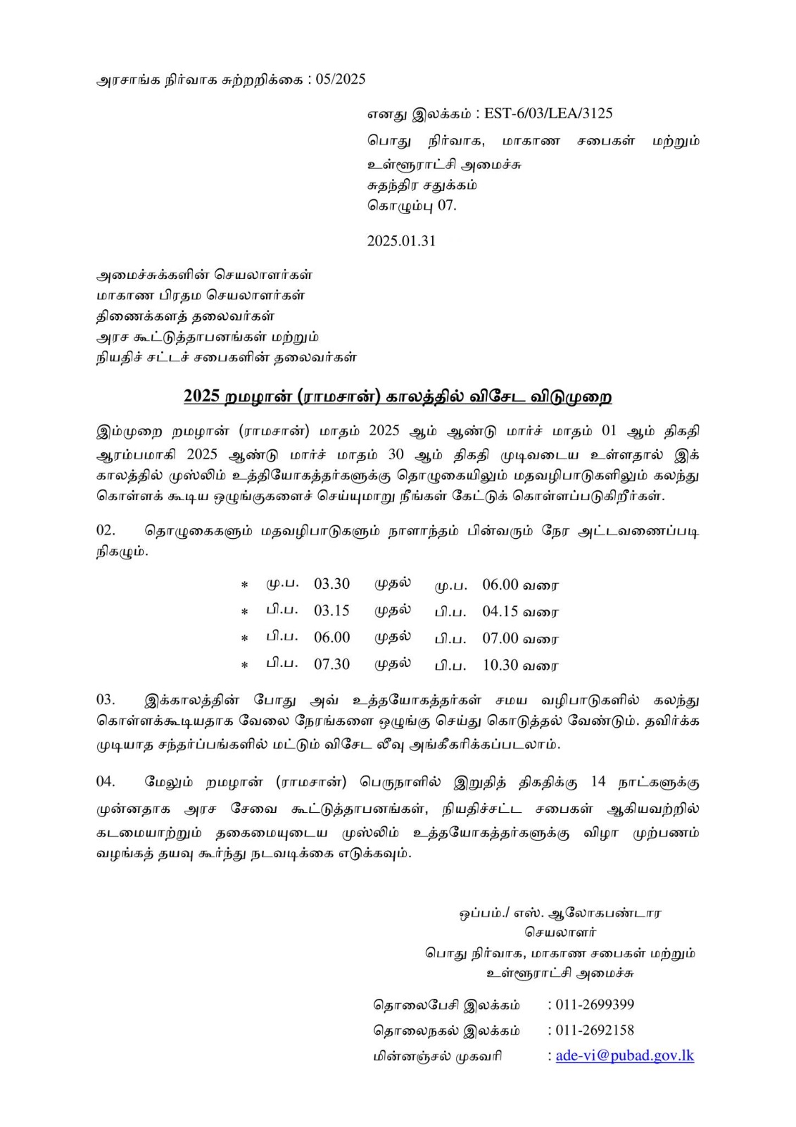 2025 றமழான் காலத்தில் முஸ்லிம் உத்தியோகத்தர்கள் தொழுகையிலும் மாதவழிபாடுகளிலும் கலந்துகொள்வதற்கு ஏற்றவகையில் ஒழுங்குககளை மேற்கொள்ளுமாறு பொது நிர்வாக, மாகாண சபைகள் மற்றும் உள்ளுராட்சி அமைச்சு அறிவித்துள்ளது.