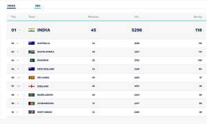 ICC வெளியிட்டுள்ள சமீபத்திய தரவரிசைப் பட்டியலில், இந்திய அணி தொடர்ந்தும் முதலிடத்தில் உள்ளது.